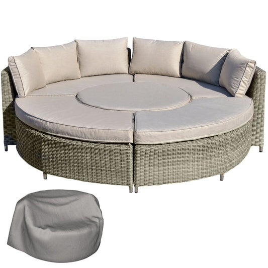 6-Seater Outdoor PE Rattan Patio Furniture Set Lounge Chair Round Daybed Liftable Coffee Table Conversation Set w/ Olefin Cushion, Grey