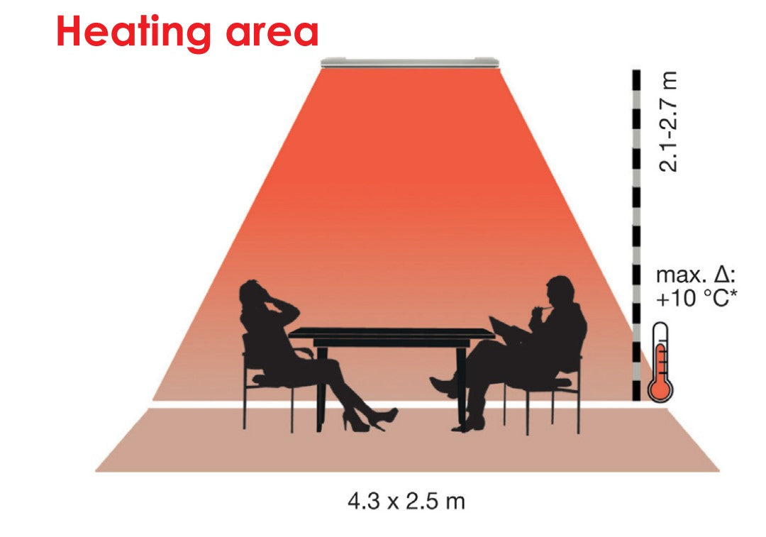 Up to 94% of the energy used is turned into ambient heat and transferred directly to nearby people and surfaces for maximum efficiency.